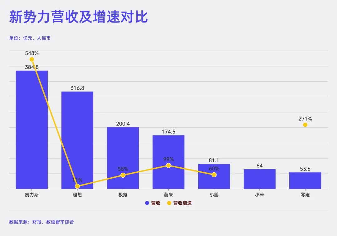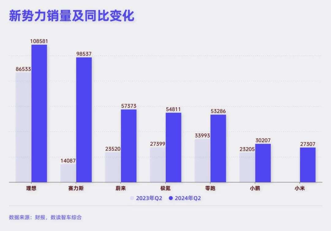按照销量规模,理想和赛力斯是第一梯队,蔚来和极氪是第二梯队,小鹏、零跑、小米是第三梯队。