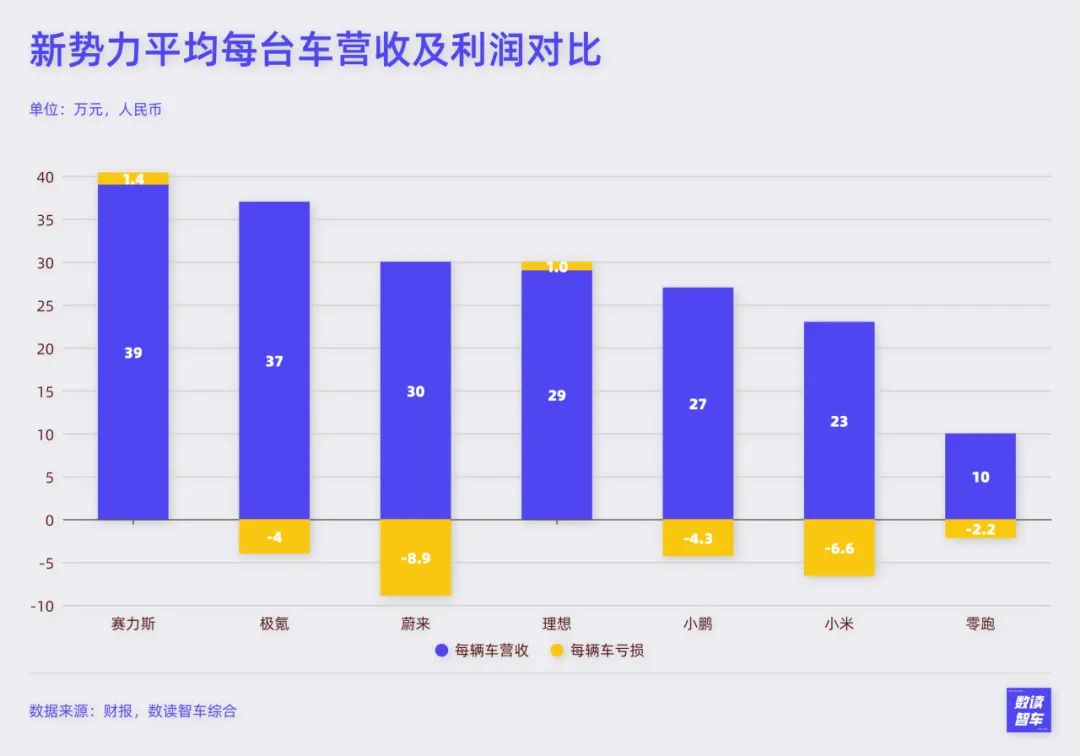 营收通常是跟随销量水涨船高,不过还有一个关键变量——价格。目前的产品布局,蔚来、理想、极氪、问界的价格段位较高,主力车型都在20万以上。小鹏、小米的定价居中,其中小鹏车型分布广泛,小米最高价车型不超过30万。零跑价格占位较低。