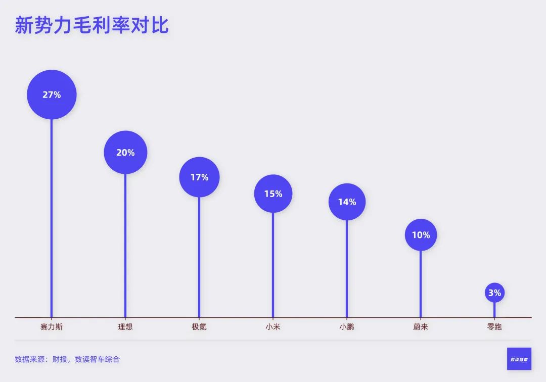 纵向比较,7家车企中大多数毛利率都在大幅提升,蔚来同比增长8.5个点,极氪增加5个百分点,赛力斯增加23.3个百分点,小鹏、零跑则由负转正。可见,在内卷的同时,各家车企也都在努力提升经营稳健度。