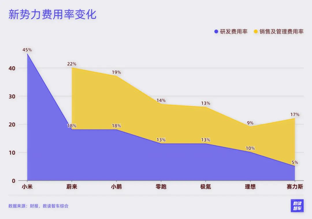7家车企的费用率体现了这种发展阶段的差别。小米是新车企,目前仍然是造车初期,因此其研发费用率高达45%,其他已经走过早期发展阶段的车企,合计费用率都不会超过40%,研发费用率最高的也不会超过20%。