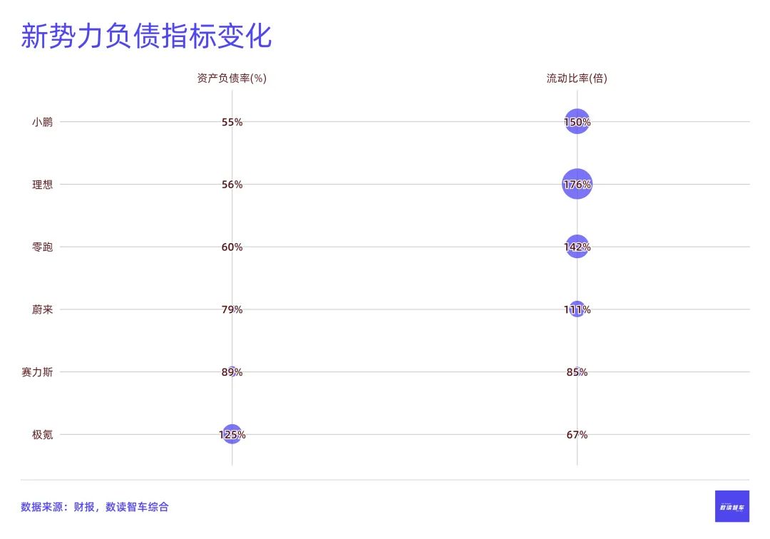 7家车企的经营风险并不大,整体的负债水平在合理范畴。极氪和赛力斯的偿债压力稍大,极氪的资产负债率高达125%,流动比率0.7倍,现金储备是7家车企中最低的,只有80亿。资产负债率高,流动比率低,现金储备少,极氪短期内还需要吉利的支持。赛力斯的资产负债率89%、流动比率0.85倍,也是指标较高的车企。