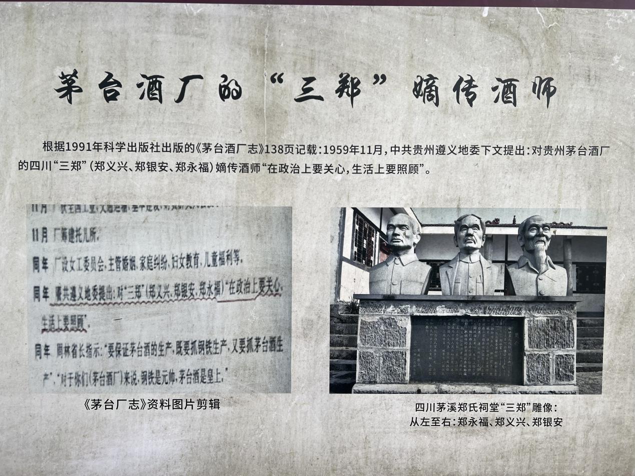从历史的维度审视,茅溪镇拥有着悠久而厚重的酿酒历史。它与茅台镇如同赤水河两翼的双胞胎,左岸的茅溪,溪为谷水,右岸的茅台,台是平地。茅溪镇的酿酒传统源远流长,根据《茅台郑氏族谱》记载:郑氏祖郑佑自明朝万历二十三年(1595年)入川,凭借蒸馏酿酒技术在赤水河畔的茅溪镇(与茅台镇隔河相望)开始酿酒。郑义兴,郑银安,郑永福都是国营茅台酒厂第一代酿酒大师,历史上著名的“茅台三郑”。1959年中共遵义地委提出对三郑“在政治上要关心,生活上要照顾。”原文摘自茅台酒厂著《茅台酒厂志》1991.05版第138页:茅台酒厂大事记篇。郑义兴,郑银安,郑永福分别是解放前成义,荣和,恒兴,三大烧坊的酒师。“三郑”尤其是郑义兴等先辈们,以其精湛的酿酒技艺和对品质的执着追求,为茅溪镇酱酒的发展奠定了坚实的基础。他们的贡献不仅在于酿造出了优质的酱香白酒,更在于传承了一种工匠精神,成为茅溪镇酒文化的重要组成部分。