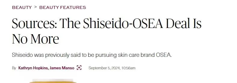 值得注意的是,今年7月,市场曾传闻资生堂欲收购美国加州护肤品牌OSEA。但短短两月过去,这场被广泛报道的收购事件为何会以终止交易划下句点?