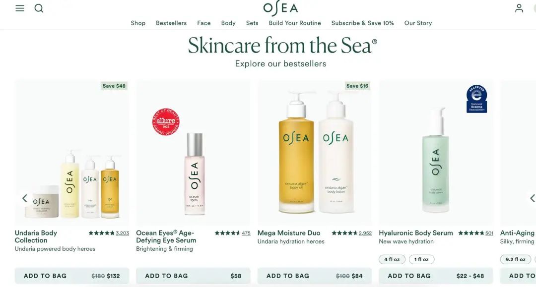 青眼搜索发现,目前OSEA官网共有61款产品在售,旗下产品“Undaria藻类身体油”在今年2月被外媒WWD评为有史以来最伟大的护肤品之一。此外,品牌旗下的眼部抗衰精华、透明质酸海洋精华及胶原蛋白晚霜等亦广受消费者好评。