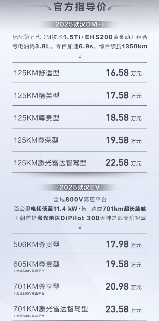 9月9日,比亚迪宣布,2025款汉EV及汉DM-i正式上市,官方指导价为16.58-23.58万元。