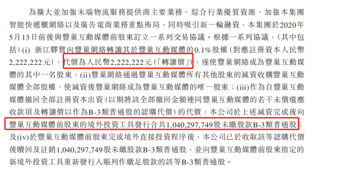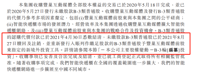 于2020年5月,丰巢收购丰巢互动媒体及发行1040297749股B-3类普通股已完成,但上述股权的股款未缴。直到2021年4月30日,丰巢才结算B-3类普通股实缴资本代价。