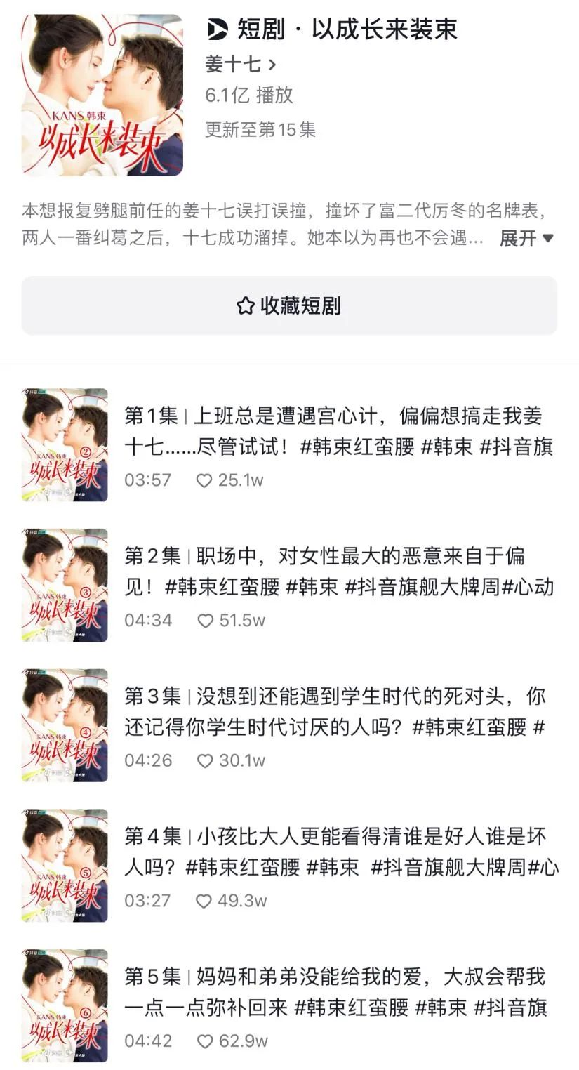 不过随着监管口径收紧,短剧回归理性,韩束今年投放的《让爱“束”手就擒》播放量只有2.3亿,就连达人姜十七自己的短剧平均播放量也只有3.67亿。资方想要卷赢短剧这个赛道,只能靠精品化之路。