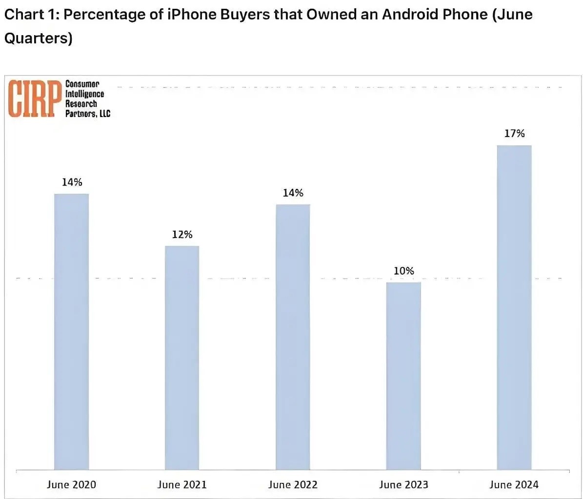 根据消费者情报研究合作伙伴(CIRP)的一份报告显示,今年第二季度购买iPhone的用户中,有17%是从安卓系统切换过来的,这一比例创下五年来新高,几乎是去年同期(10%)的两倍。