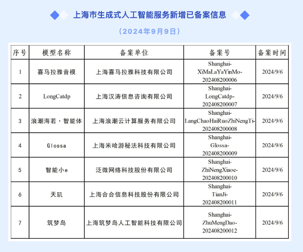 据“网信上海”微信公众号消息,截至9月9日,上海市新增7款已完成备案的生成式人工智能服务,累计已完成41款生成式人工智能服务备案。