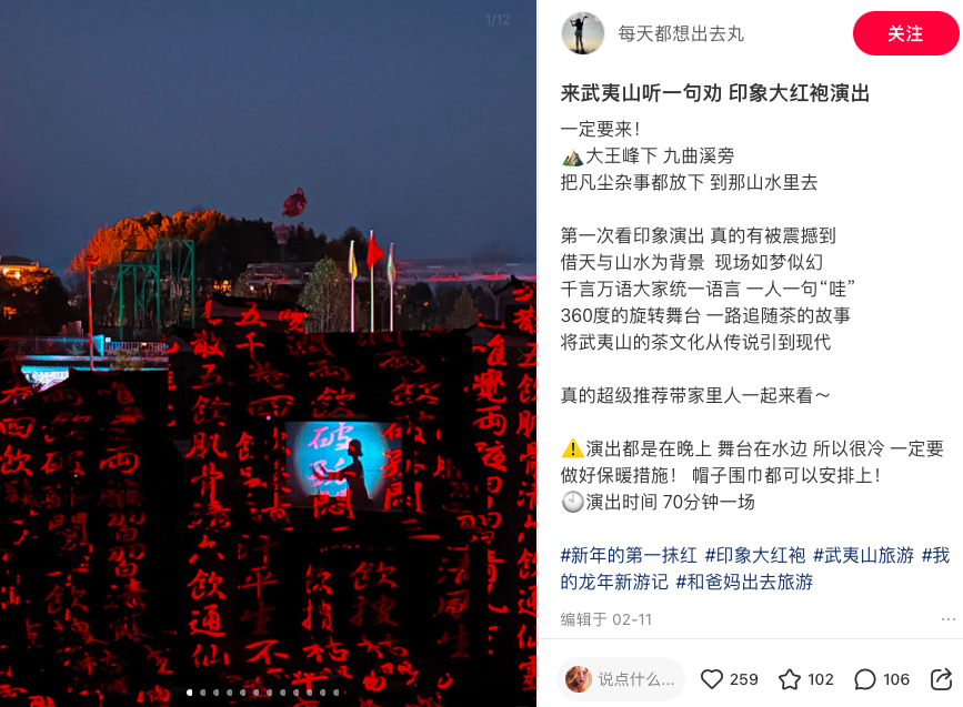 “来武夷山听劝,印象大红袍演出一定要来!真的有被震撼到,天与山水为背景,现场如梦似幻,千言万语大家统一语言,一人一句‘哇’。360度的旋转舞台,一路追随茶的故事,将武夷山的茶文化从传说引到现代,真的超级推荐带家里人一起来看~”一位小红书博主在社交平台分享自己观看《印象大红袍》的感受。