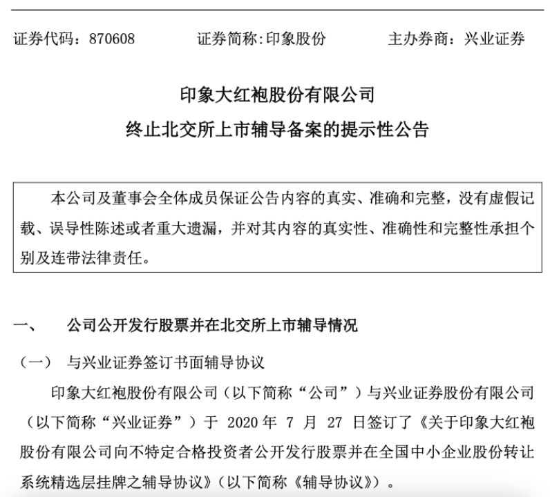 但在辅导四年后,2024年5月,印象股份发布公告表示,与兴业证券签署《辅导协议的终止协议》,宣布终止北交所上市辅导。