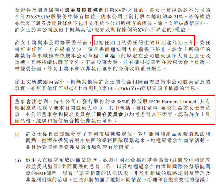 根据华兴资本披露的信息显示,持有约38.38%的控股股东CR Partners Limited要求任命许彦清为董事。董事会和提名委员会认为她具备品格、经验和诚信适合担任非执行董事。9月6日生效,任期为三年。