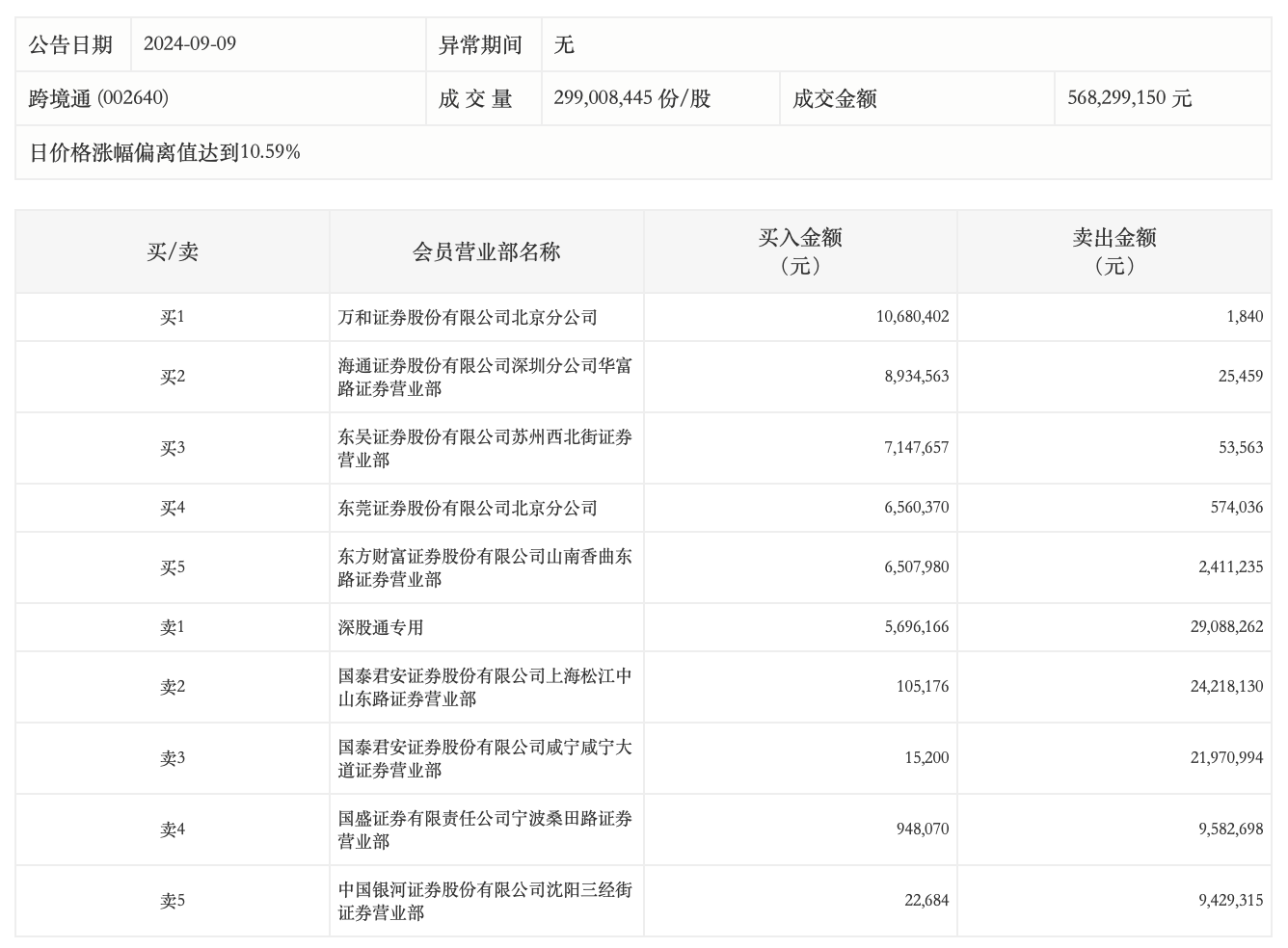 9月9日,跨境通今日涨停,龙虎榜数据显示,上榜营业部席位全天成交1.44亿元,占当日总成交金额比例为25.33%。其中,买入金额为4661.83万元,卖出金额为9735.55万元,合计净卖出5073.73万元。