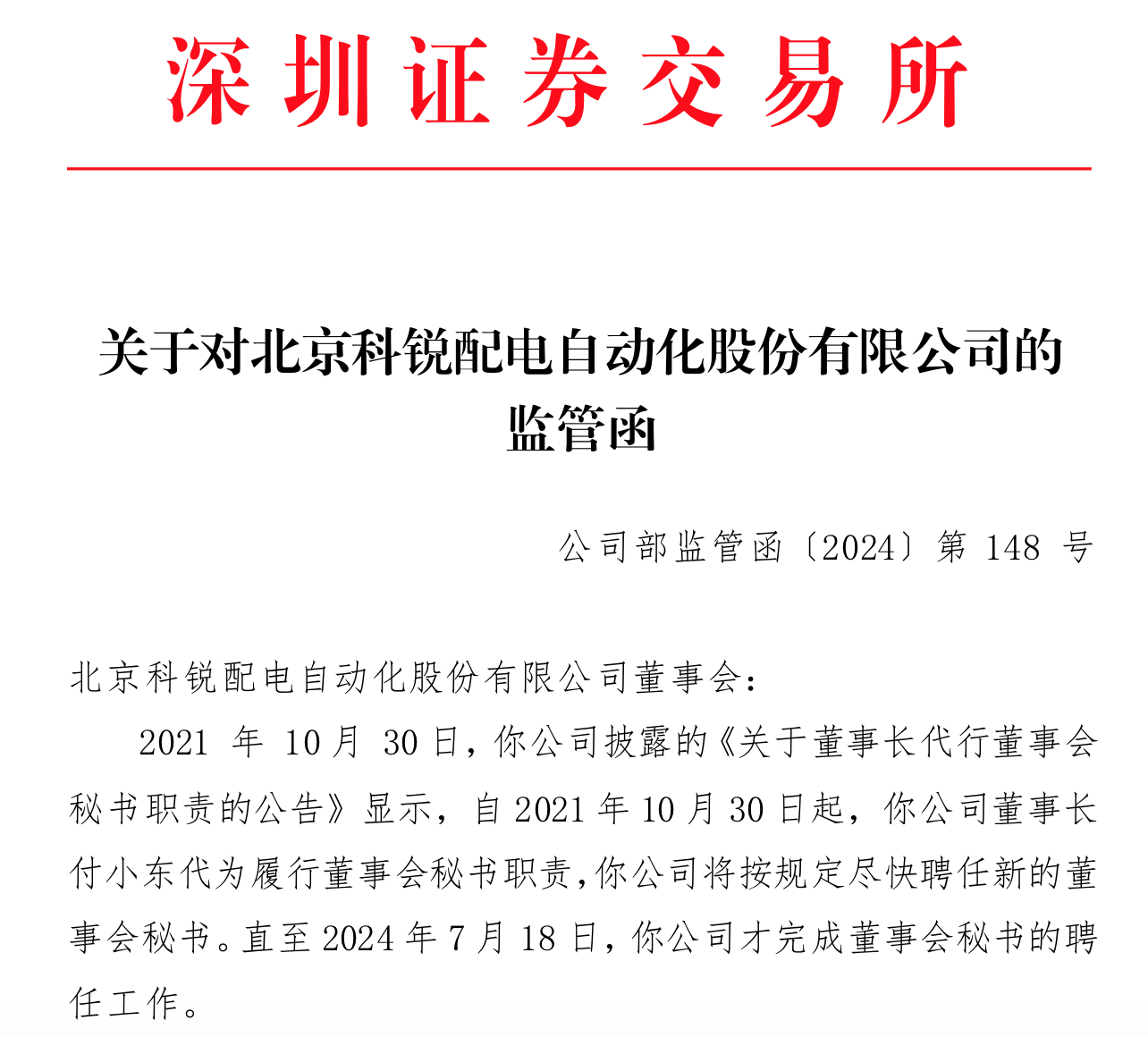 也就在8月底,北京科锐收到一份监管函,其中显示,公司2021年10月表示尽快聘任新的董秘,结果2024年7月才完成,圣属性为违反了相关规定,交易所希望公司及全体董事、监事、高级管理人员认真吸取教训,并提醒遵守法律法规,提高上市公司规范运作水平,杜绝此类事件发生。