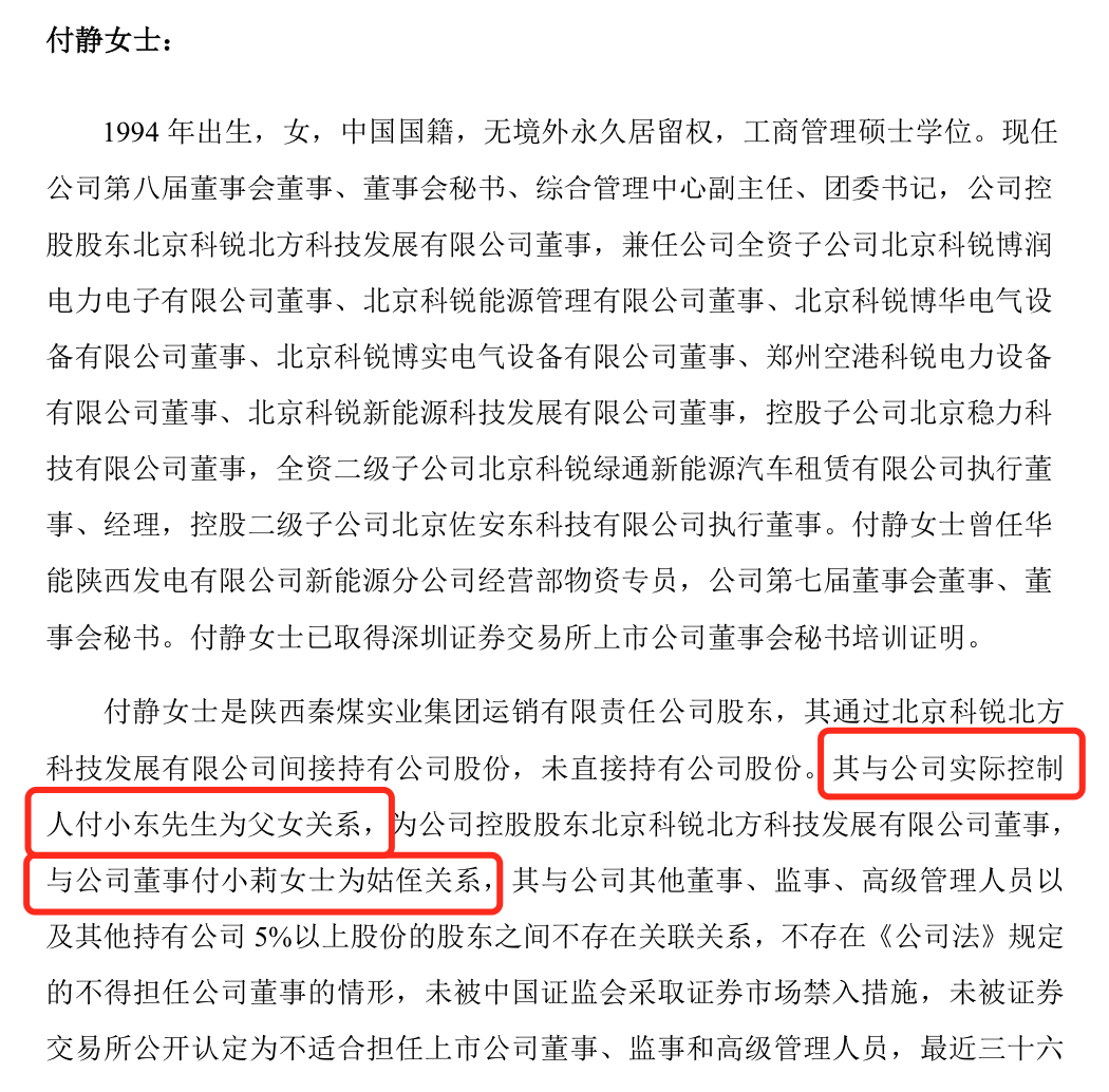 付静1994年出生,现任公司第八届董事会董事、董事会秘书、综合管理中心副主任、团委书记,公司控股股东北京科锐北方科技发展有限公司董事,兼任公司全资子公司北京科锐博润电力电子有限公司董事、北京科锐能源管理有限公司董事、北京科锐博华电气设备有限公司董事、北京科锐博实电气设备有限公司董事、郑州空港科锐电力设备有限公司董事、北京科锐新能源科技发展有限公司董事,控股子公司北京稳力科技有限公司董事,全资二级子公司北京科锐绿通新能源汽车租赁有限公司执行董事、经理,控股二级子公司北京佐安东科技有限公司执行董事。付静曾任华能陕西发电有限公司新能源分公司经营部物资专员。