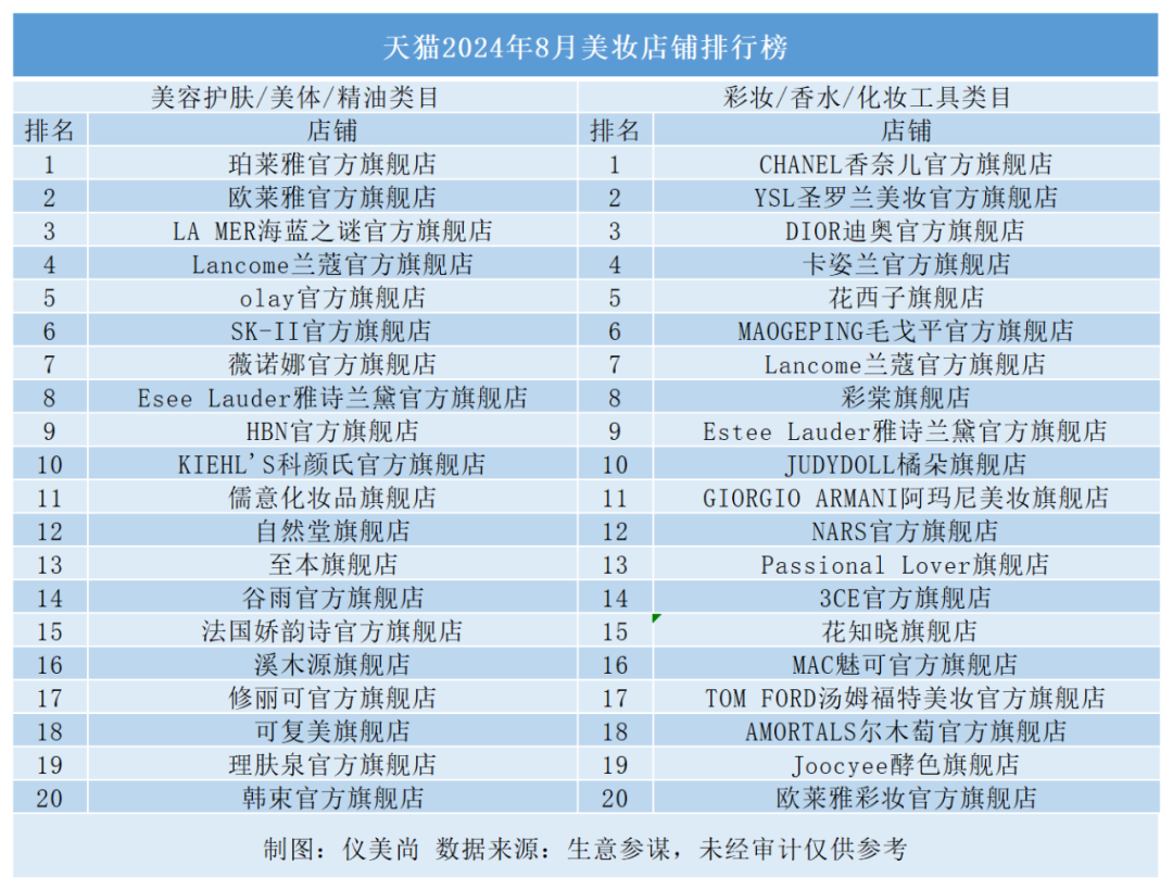 仪美尚综合生意参谋、飞瓜数据(抖音版、快手版)、蝉魔方等平台的信息发现——在天猫,交易总量TOP20店铺的访客数,相较7月环比增长61.5%;在抖音,美妆成交额环比增长32%;快手美容护肤类目TOP20品牌的销售额环比大涨91.6%。
