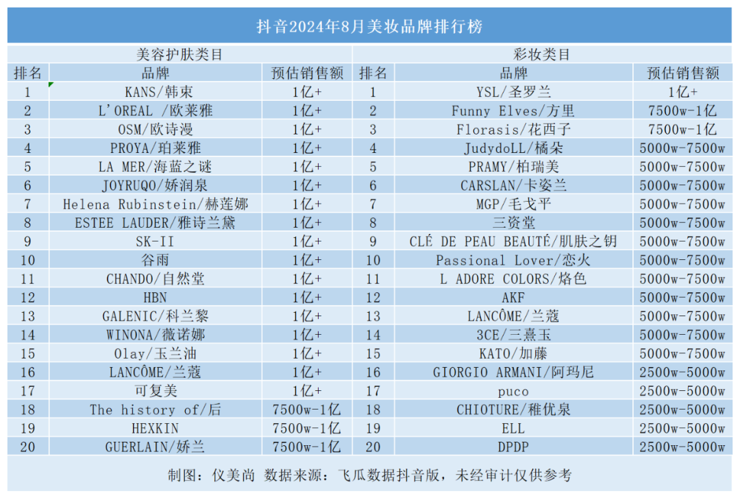 仪美尚根据飞瓜数据抖音版,梳理出抖音8月份TOP20的美容护肤类目品牌和彩妆类目品牌。