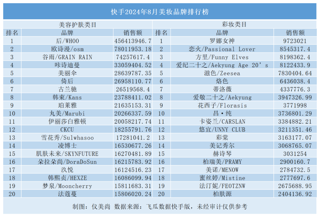 快手:美容护肤TOP20环比增长91.6%,后/Whoo月销近5亿霸榜第一