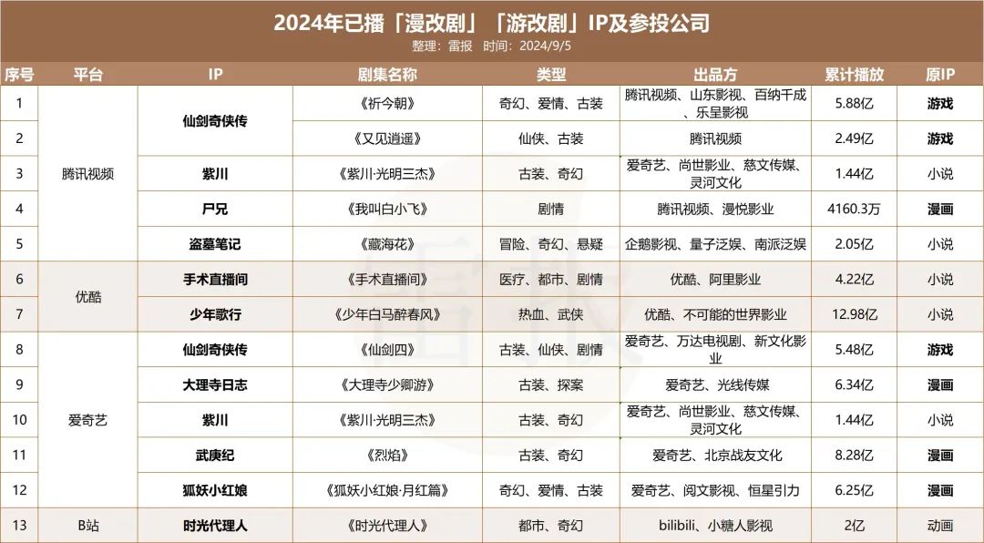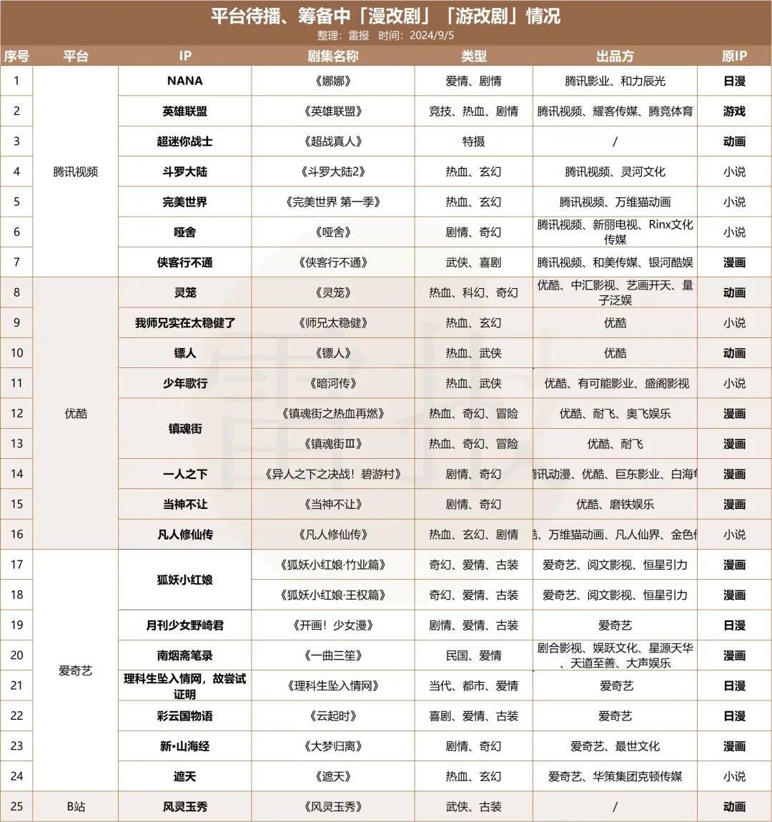 详细来看,雷报盘点了截至发稿日,2024年各平台已播漫改、游改剧的IP及参投公司情况(人工统计存在误差),其中部分作品在双平台播出,因此各平台实际上新漫改剧共计12部,另外,还有至少25部剧集待播或者筹备中。
