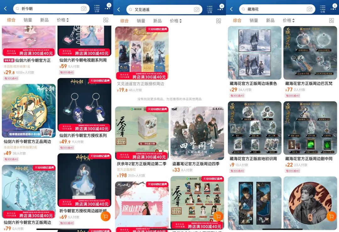 除了这两部作品,其他IP真人剧的授权衍生品却没有什么“水花”。腾讯视频草场地旗舰店中,《祈今朝》《又见逍遥》《藏海花》等周边产品,除了“流量小花”虞书欣的亚力克挂件卖得不错以外,其他产品的销量都屈指可数;与此同时,从更现实的层面看,今年播出的绝大多数IP真人剧,因为剧集本身的热度不达标,甚至都没有进行衍生品项目的开发。
