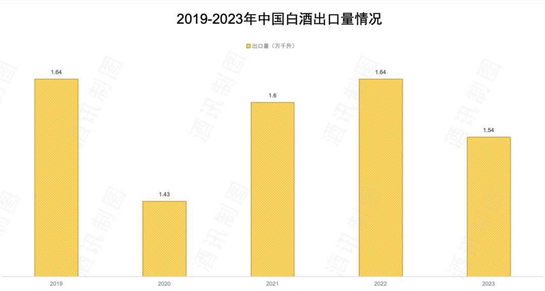 来自海关总署的数据显示,2023年白酒商品累计出口量约1.5万千升,占总产量的比重仅为0.2%。总出口额约为8亿美元(约57亿元),其中,贵州茅台海外营收的43.5亿元就占去了超过七成,五粮液出口的10.04亿元再分去约两成。可以看到,无论是从出口总量还是品牌活跃度来看,白酒出海依然在起步阶段。
