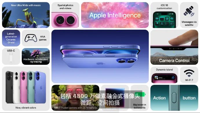 苹果方面表示,iPhone 16 是为 Apple Intelligence 从头开始打造的,由 A18 芯片架构的行业领先性能提供支持。