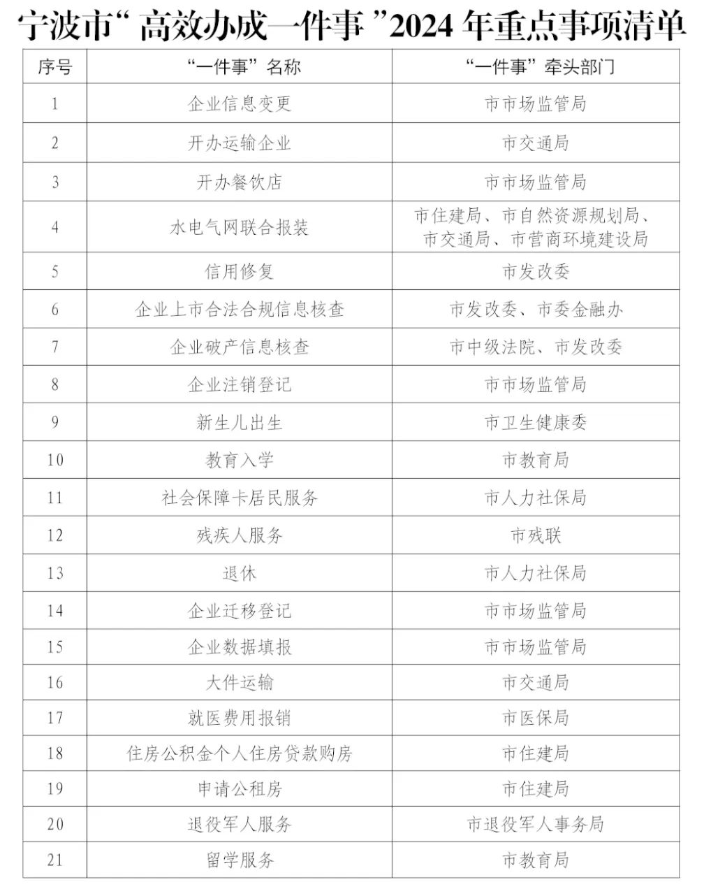 《实施意见》还明确了宁波市“高效办成一件事”2024年重点事项清单
