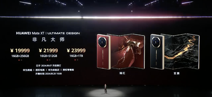 9月10日,华为三折叠屏手机Mate XT非凡大师正式发布,展开最大10.2英寸,厚度仅3.6毫米。价格方面,256GB版本售价19999元、512GB版本售价21999元、1TB版本售价23999元。产品已于9月7日开启预订,将于9月20日10:08正式开售。