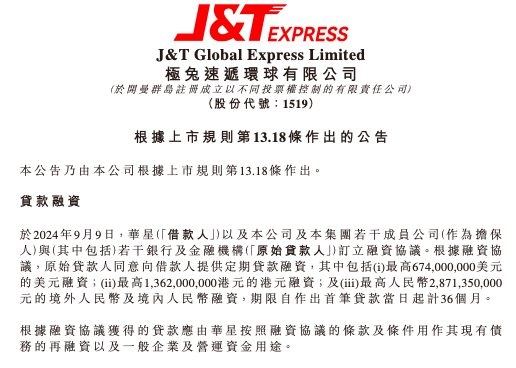 极兔速递发布的公告显示,极兔速递的全资附属公司华星集团、极兔速递以及极兔速递若干成员公司,与原始贷款人订立融资协议。其中华星集团是借款人,极兔速递以及极兔速递若干成员公司则是担保人。