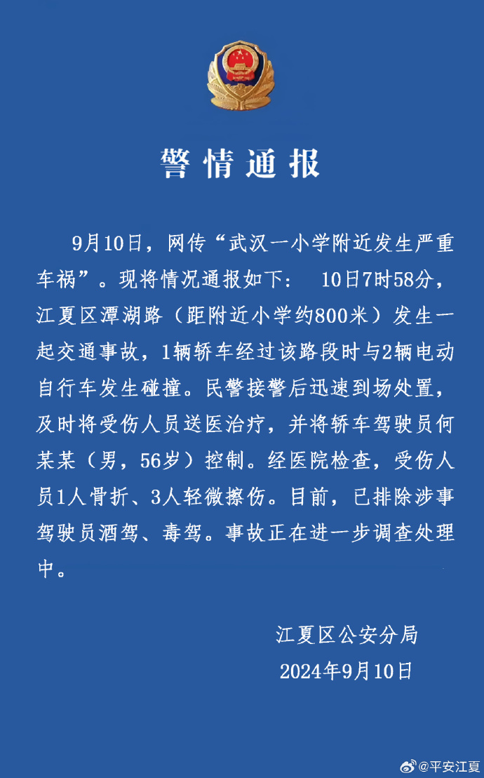 武汉市公安局江夏区公安分局发布警情通报。9月10日,网传“武汉一小学附近发生严重车祸”。现将情况通报如下: 10日7时58分,江夏区潭湖路(距附近小学约800米)发生一起交通事故,1辆轿车经过该路段时与2辆电动自行车发生碰撞。民警接警后迅速到场处置,及时将受伤人员送医治疗,并将轿车驾驶员何某某(男,56岁)控制。经医院检查,受伤人员1人骨折、3人轻微擦伤。目前,已排除涉事驾驶员酒驾、毒驾。事故正在进一步调查处理。