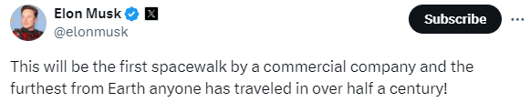 马斯克亲自下场认证这一次任务的突破性:“这将是商业公司首次进行的太空行走,也是半个多世纪以来,人类距离地球最为遥远的太空行走!”