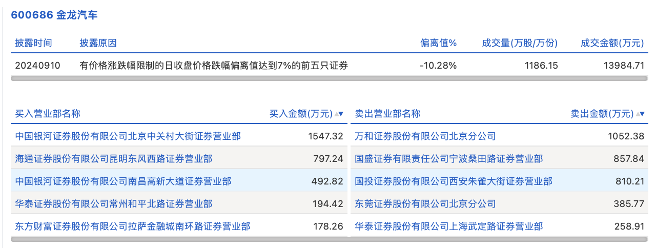 9月10日,金龙汽车今日跌停,龙虎榜数据显示,上榜营业部席位全天成交6575.17万元,占当日总成交金额比例为47.02%。其中,买入金额为3210.06万元,卖出金额为3365.1万元,合计净卖出155.04万元。