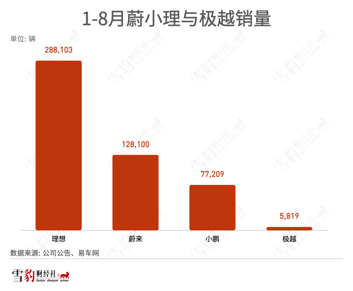这些措施一定程度上提振了销量。8月,极越交付了2117辆汽车,创年内月交付新高。但相比于头部新造车品牌,极越仍有不小差距。