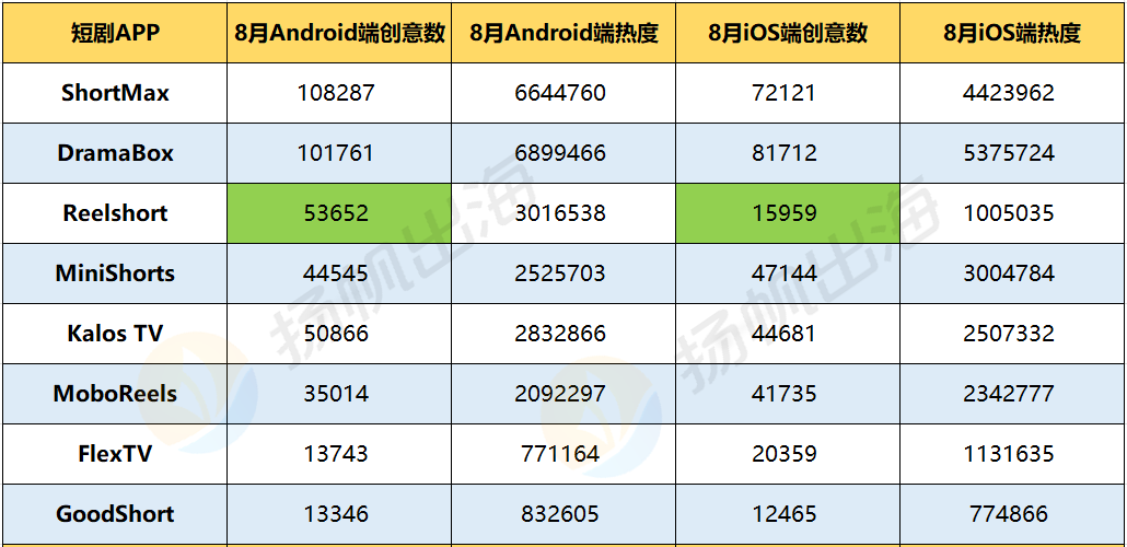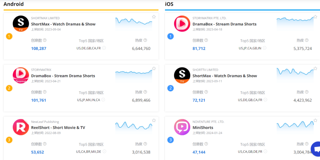 广大大数据显示,8月份,ShortMax、DramaBox、Reelshort为安卓渠道投放的前三名,DramaBox、ShortMax、MiniShorts为iOS渠道下的投放前三位。
