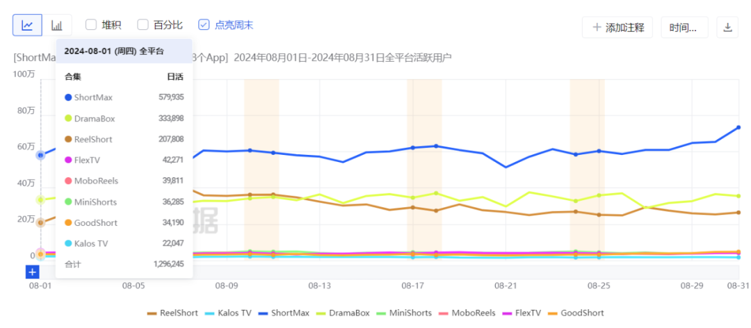 用户活跃度方面,ShortMax遥遥领先,其DAU保持在50万到60万之间。