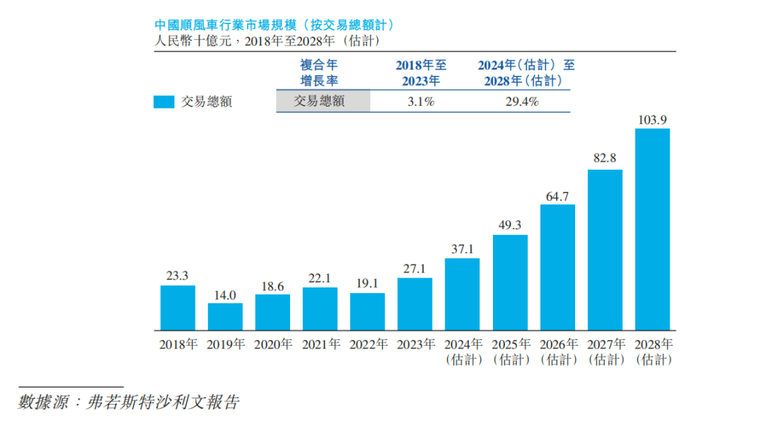 弗若斯特沙利文数据显示,顺风车市场的预计交易总额将从2024年的371亿元增加至2028年的1039亿元,复合增长率为29.4%。