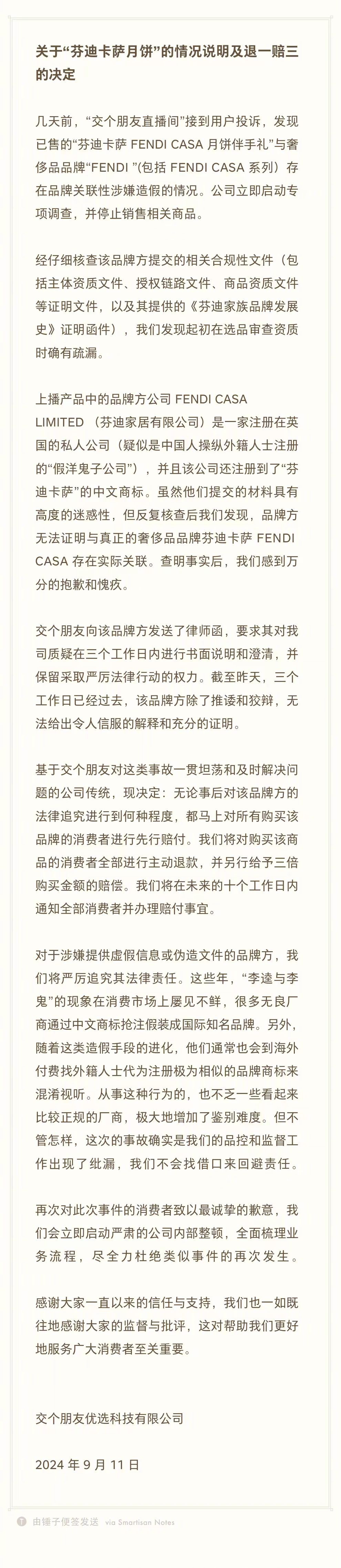 9月11日,交个朋友直播间官方微博发布公告称,接到用户投诉,发现已售的“芬迪卡萨FENDI CASA月饼伴手礼”与奢侈品品牌“FENDI”(包括FENDI CASA系列)存在品牌关联性涉嫌造假的情况。公司立即启动专项调查,并停止销售相关商品。公司反复核查后发现,品牌方无法证明与奢侈品品牌芬迪卡萨FENDI CASA 存在实际关联。公司决定对所有购买该品牌的消费者进行先行赔付:将对购买该商品的消费者全部进行主动退款,并另行给予三倍购买金额的赔偿。公司将在未来的十个工作日内通知全部消费者并办理赔付事宜。