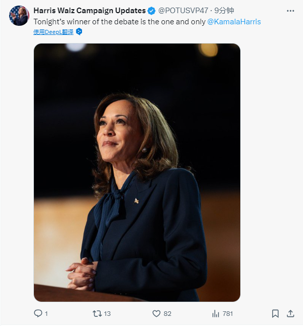 当地时间9月10日晚,美国前总统、共和党总统候选人特朗普同美国副总统、民主党总统候选人哈里斯参加由美国广播公司(ABC)在费城举办的电视辩论。辩论结束后,哈里斯竞选团队表示,哈里斯是今晚唯一的获胜者。特朗普也在社交平台上连发多条消息庆祝胜利,称这是他有史以来最棒的一次辩论,“尤其因为这是场三(哈里斯和两位主持人)对一的对决”。
