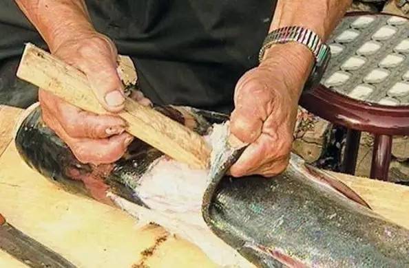 将阴干的鱼皮抚平,先用铁铲轻轻铲去鱼皮上的鱼肉、油脂,再用木齿锯刮去鱼皮上的鱼鳞。