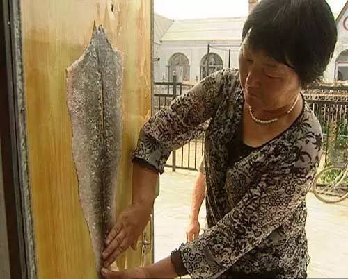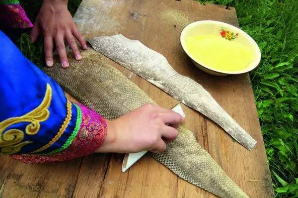 把剥下来的鱼皮放在木板上撑开、阴干,阴干后的鱼皮要一张一张卷起备用。暂时不鞣制的,防虫、防腐、防潮湿处理后储存起来,到闲暇时再鞣制。