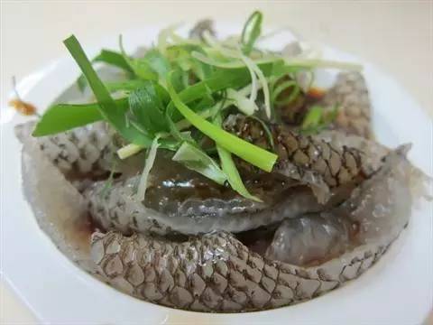 先将要剥皮的鱼稍微控干,擦掉粘液,去掉头尾,再用钢刀把鱼的脊背两面从头到尾划开,然后用木刀将鱼皮鱼肉慢慢剥离(金属刀易碰坏鱼皮,影响鱼皮质量),当两面的鱼皮剥至腹部时,再用手使劲将鱼皮撕下来,保持鱼皮的完整性。