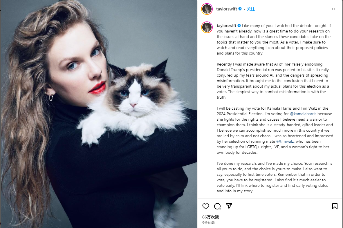 当地时间9月10日晚,美国前总统、共和党总统候选人特朗普同美国副总统、民主党总统候选人哈里斯参加由美国广播公司(ABC)在费城举办的电视辩论。辩论结束后,泰勒·斯威夫特在社交媒体发帖称,最近得知有不实消息称“她支持特朗普”,为此她在此做出澄清以对抗假消息。泰勒·斯威夫特说,她将在2024年总统大选中投票给哈里斯,因为她“为权利而战”。