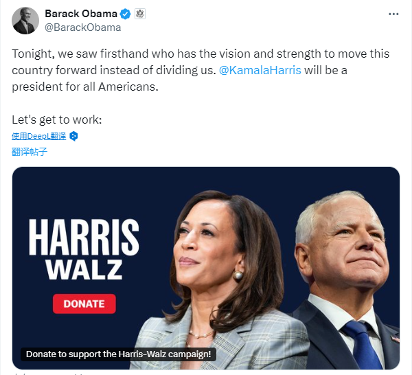当地时间9月10日晚,美国前总统、共和党总统候选人特朗普同美国副总统、民主党总统候选人哈里斯参加由美国广播公司(ABC)在费城举办的电视辩论。辩论结束后,美国前总统奥巴马在社交平台上表示,今晚大家亲眼目睹了谁拥有推动这个国家前进而不是分裂国家的远见和力量。哈里斯将成为所有美国人的总统。