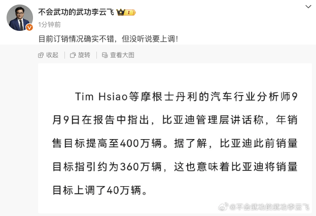 针对比亚迪年销售目标上调至400万辆传闻,比亚迪集团品牌及公关处总经理李云飞9月11日午间在微博发文称,“目前订销情况确实不错,但没听说要上调。”