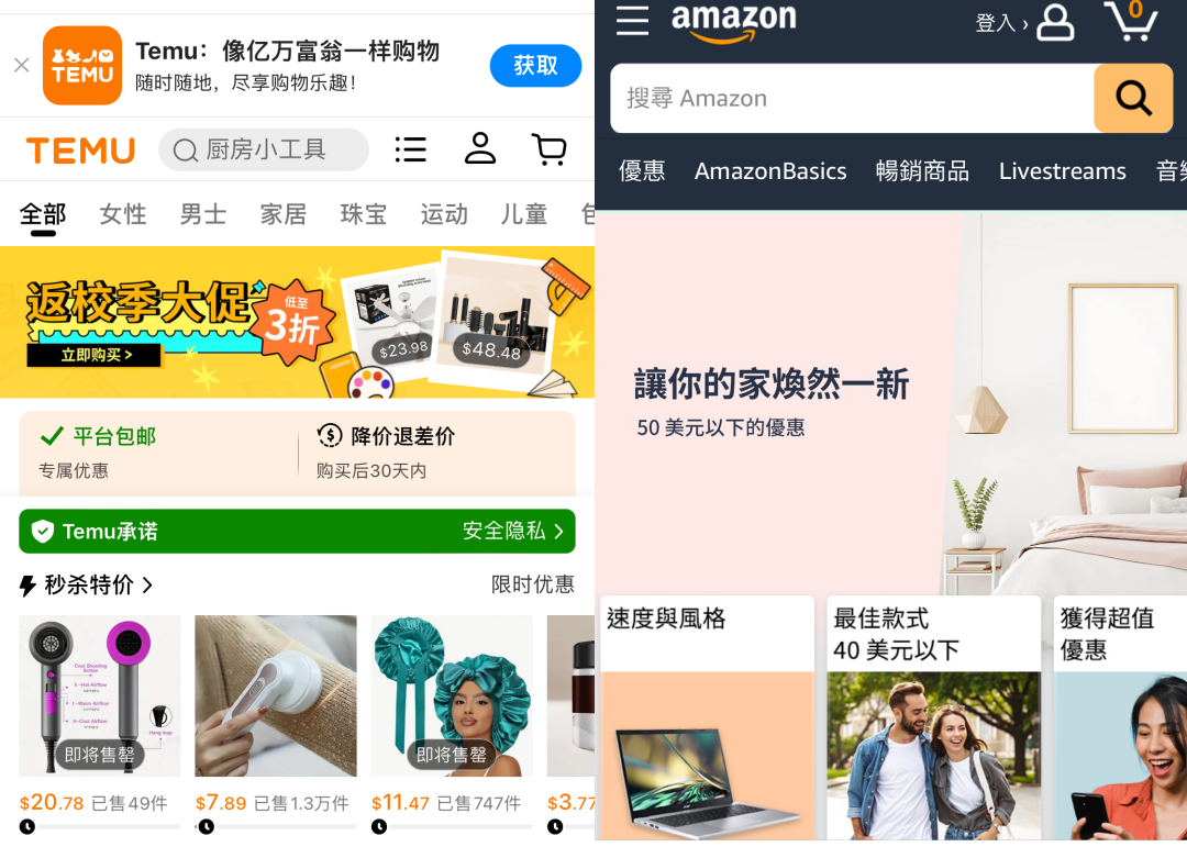 点进Temu和亚马逊的官网,你会发现二者风格截然不同。