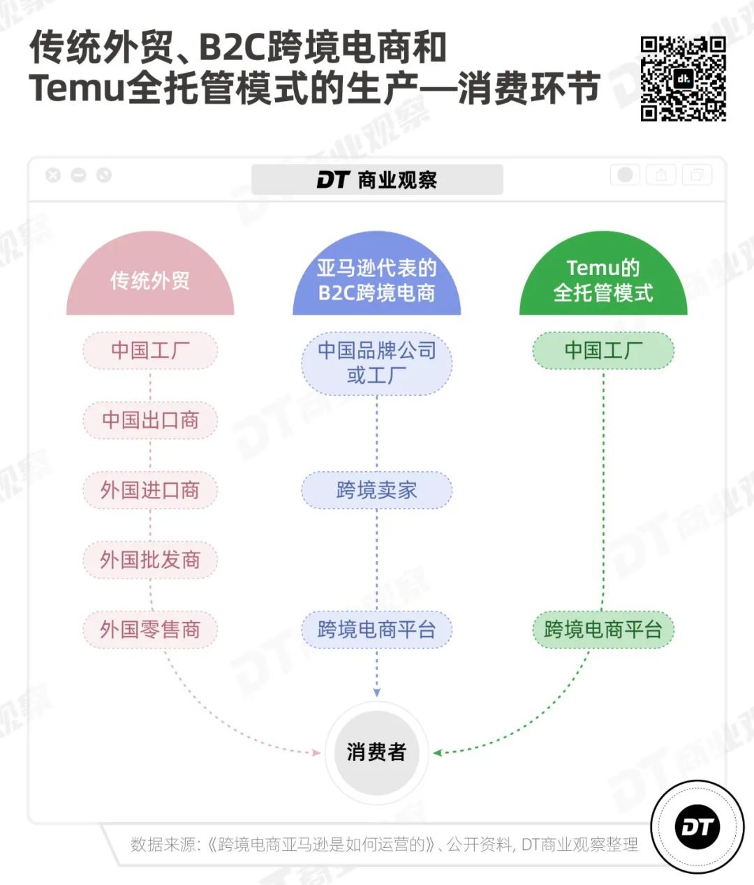 Temu 则是第三种模式,它连“跨境卖家”这个环节都没有。背靠拼多多的Temu,可以直接从源头工厂拿货卖给C端消费者,整个流程更精简、更直接。