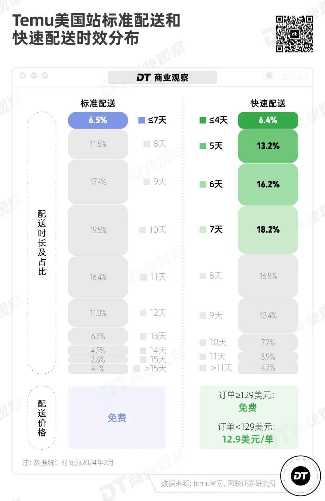 从今年2月Temu美国站的配送时长来看,8成的快递配送时长超过一周,就算是选择“快速配送”模式,消费者也很难在4天之内拿到快递。