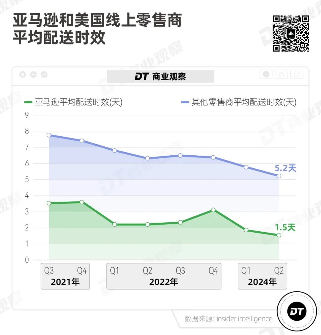 根据研究机构insider intelligence ,2023年,亚马逊的平均配送时效已经低于2天。
