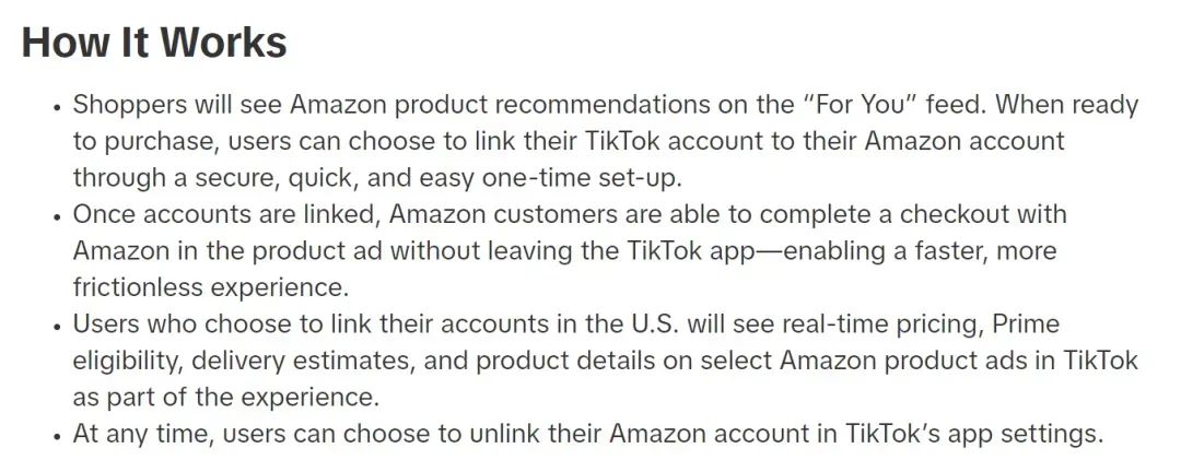 亚马逊会在Tiktok里投放广告,消费者可以将自己的Tiktok账户和亚马逊绑定,并直接在Tiktok里完成购买。
