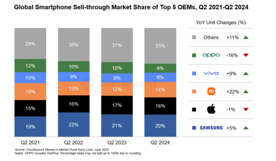 9月11日,Counterpoint发布最新报告指出,全球智能手机市场在2024年第二季度销量同比增长6%,为三年来最高的同比增长率,其中中国智能手机市场总体需求保持复苏态势,销量同比增长6%。前五大品牌与之前几个季度保持一致。三星保持第一位,苹果同比略有下降,而小米在前五大原始设备制造商中增长最快。vivo在全球最大两个智能手机市场——中国和印度——排名第一。OPPO紧随其后,位列前五。